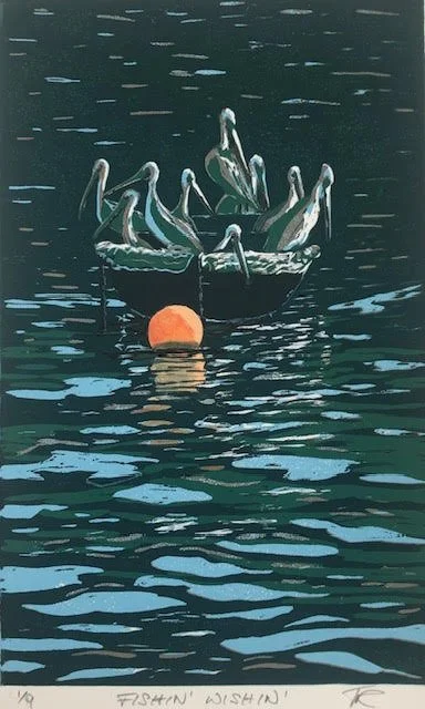 Images from top left: Bukke Bruse, linocut, Evy Justesen; Three Ravens, aquatint and pastel, Cheryl Barton; Fishin’ Wishin,’ reduction linocut, Tricia Reichert; Lion, linocut, Susan Lyon; Fox by Moonlight, reduction linocut, Helen K Davie; Baby Goat, engraving, Cheryl Barton; Future Shock, mono print (etching on fabric over monotype on paper), Barbara Rosenthal; Morro Bay Kites and Rock, linocut, Paul LaRiviere. And two photos from the hanging of the show! Click or tap an image to see an enlargement.
